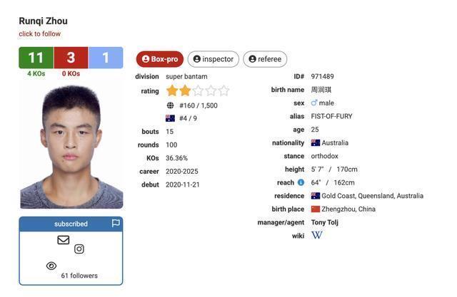 首先,针对外界关于他国籍的疑问,周润琪表示自己从未更改国籍,始终是中国公民。他解释,因在澳大利亚训练和比赛,澳洲拳协ANBF将其拳击数据库BOXREC上的国籍标注为澳洲,新闻也称其为“代表澳大利亚的中国拳手”,但这只是赛事层面的标注。 他强调自己没有澳洲绿卡和护照,只有中国护照,并表示大家可以去大使馆查我的信息,若是双国籍,欢迎举报。